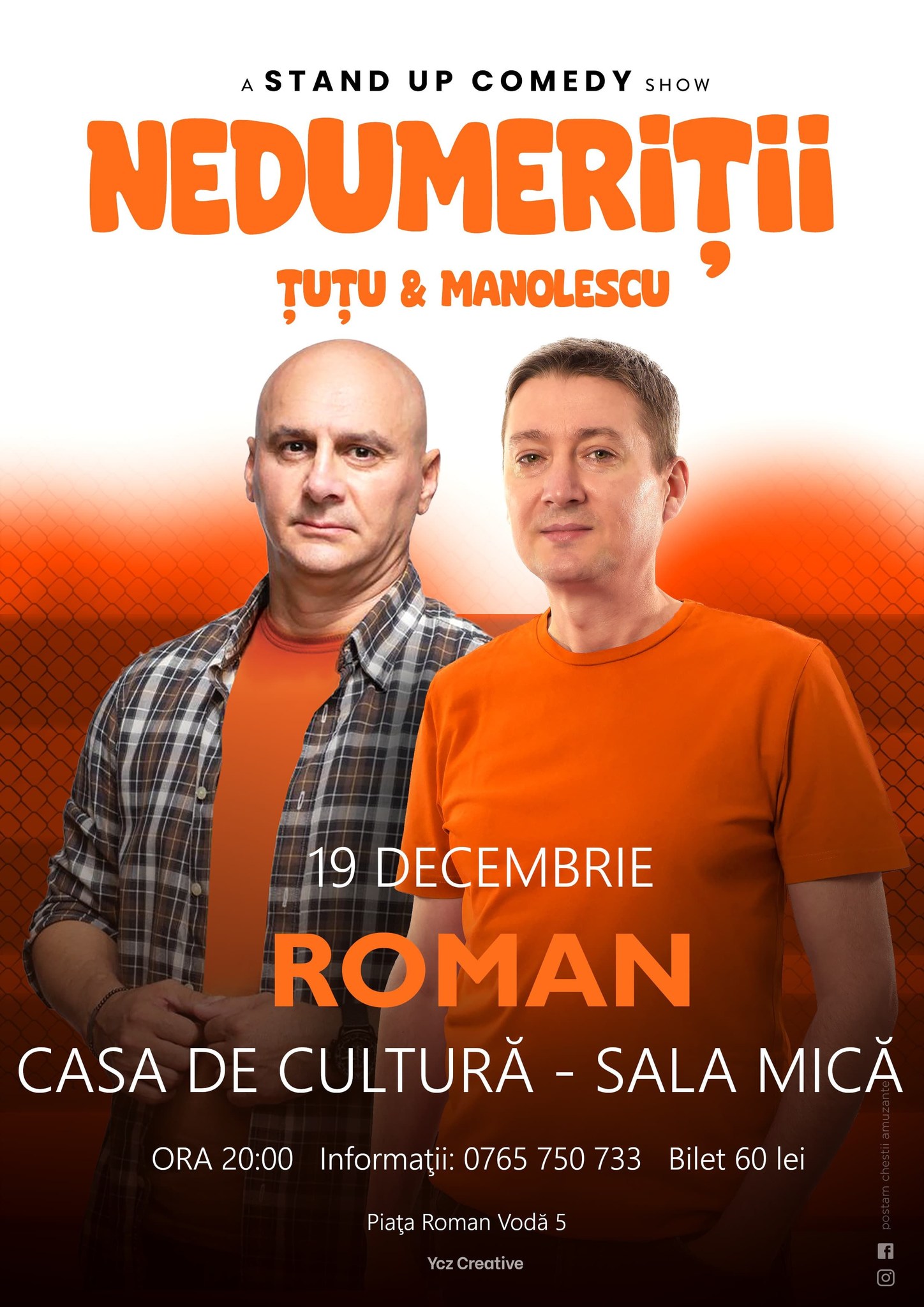 Roman, adună-ţi gaşca şi vino vineri, 19 decembrie, la Casa de Cultură, să îi vezi pe Cristi – ce mi-ai pus pe tăviţă, mamă – Manolescu şi Dan Ţuţu, un povestitor desăvârşit care te va cuceri cu naturaleţea sa.