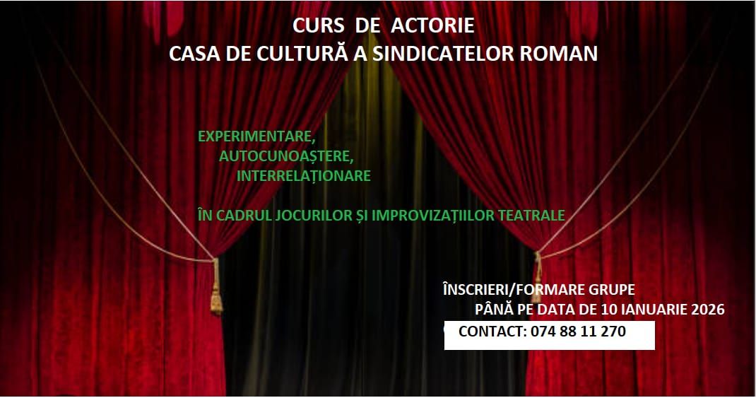 În cadrul CURSULUI DE TEATRU, care se va desfașura în Sala Mică a Casei de Cultură a Sindicatelor Roman propus pentru copii, adolescenți și adulți vor fi utilizate tehnici și procedee specifice artei actorului pornind de la jocuri și improvizații teatrale cu un parcurs evolutiv, de la simplu la complex.